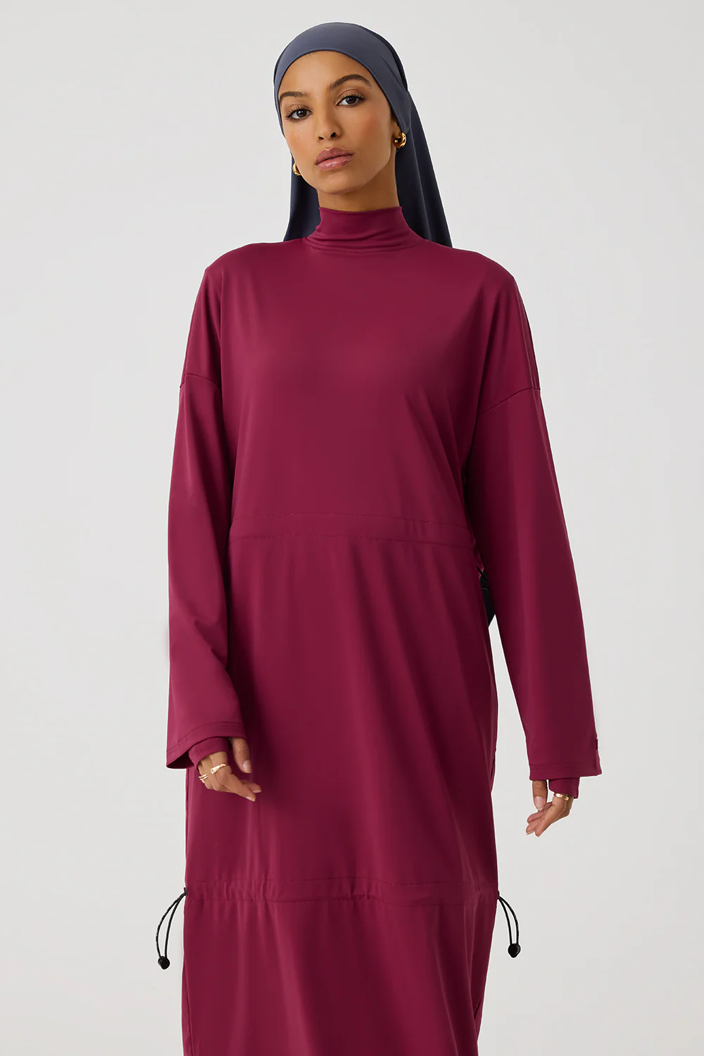 Designed to stay put as you move in the water with invisible fasteners, you get complete comfort and freedom of movement. Perfect your fit with both waist and mid-thigh cinches in the swim dress.