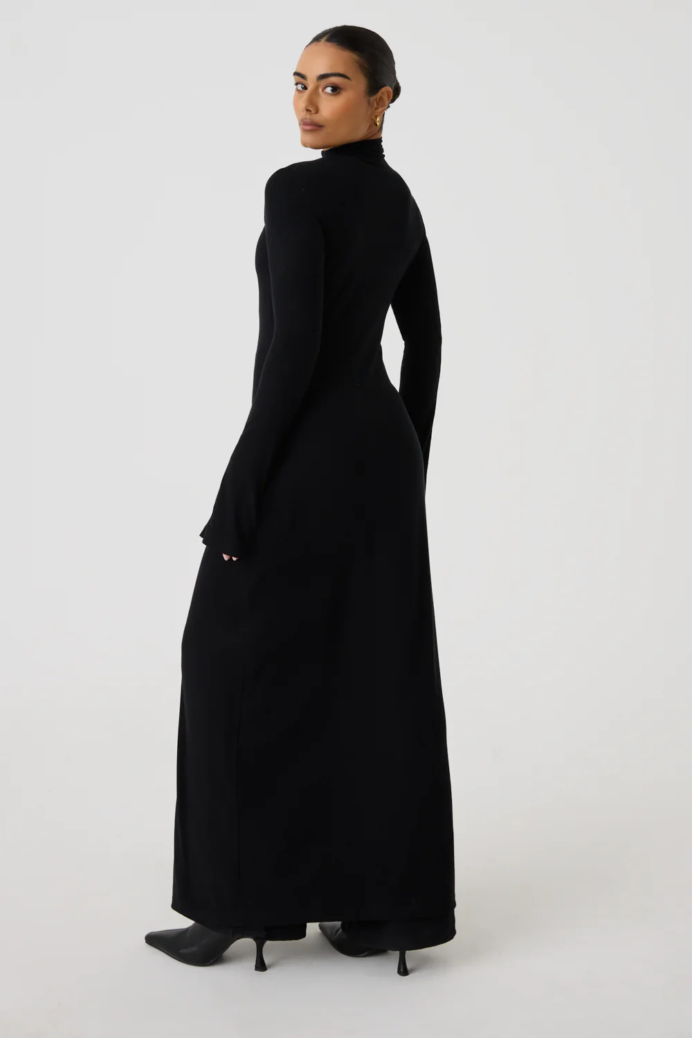 A high neckline offers refined coverage, while the funnel sleeves and front split add movement and elegance.