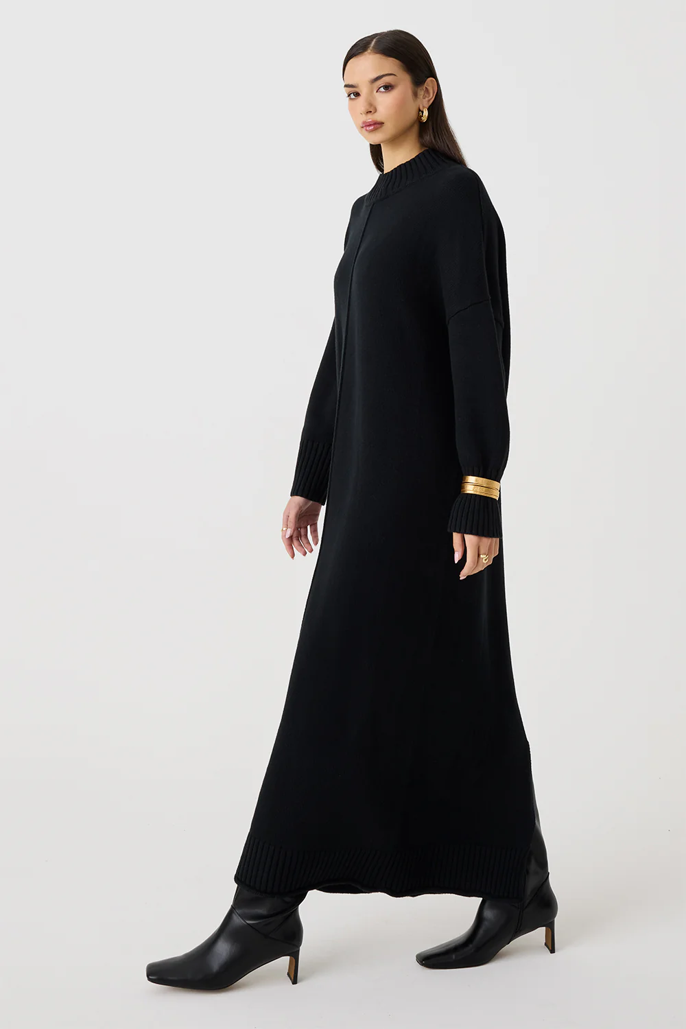 A luxurious addition to your winter wardrobe, this full-length knit dress blends warmth with refined elegance.