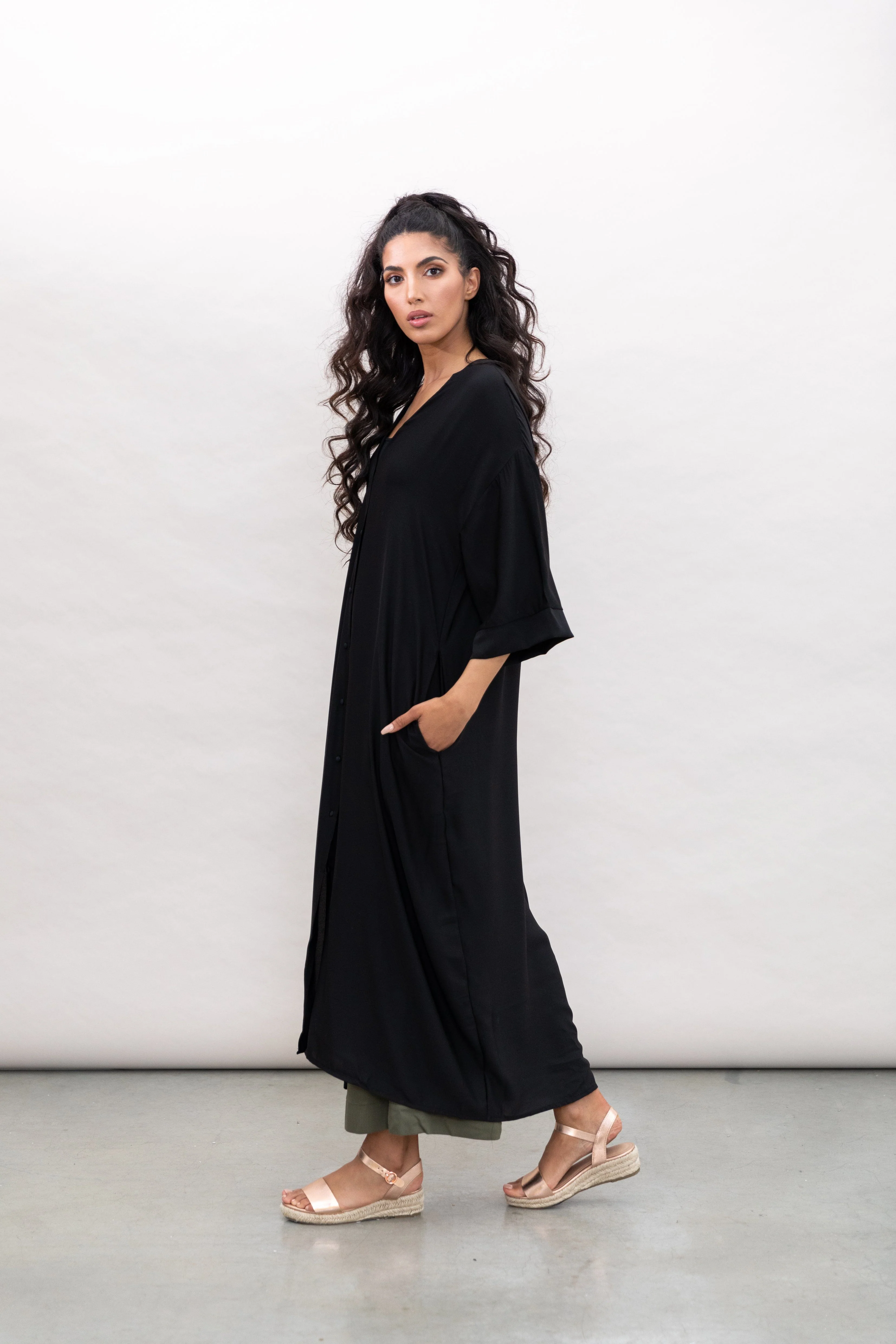 This kimono style dress is an airy piece, made from lightweight fabric to create a clean and minimalist silhouette. With a flattering V-neck and dropped sleeves. Cut for an oversized fit, featuring front buttons and concealed side pockets. Unlined.