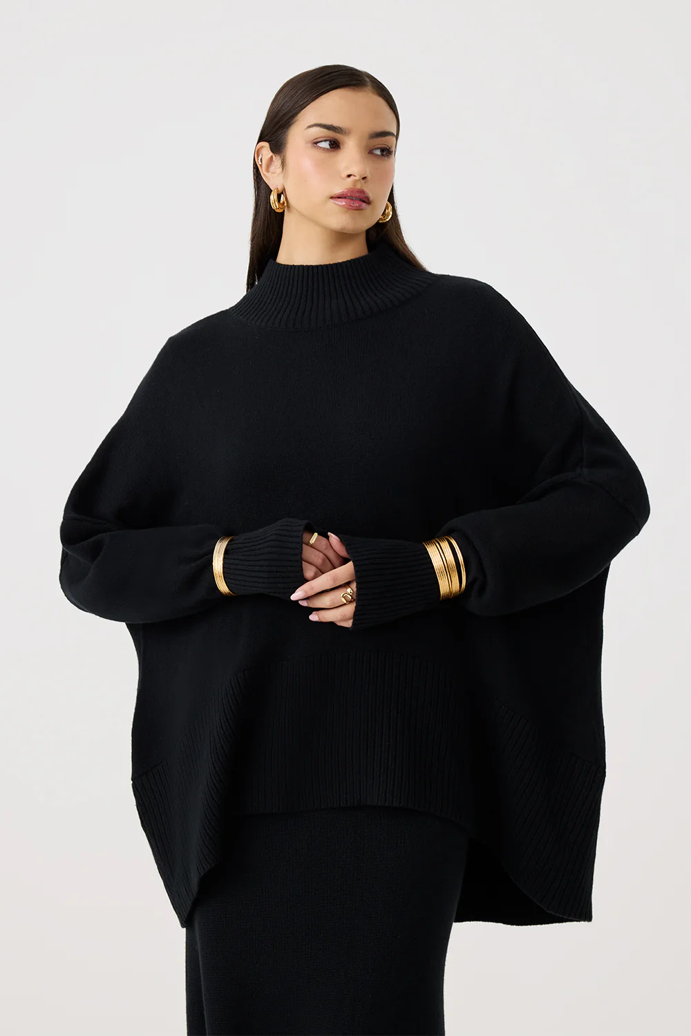 Featuring a softly structured high neck, dropped shoulders, and deep rib detailing across the cuffs and hem. The front is finished with a subtle curved hemline for added shape and coverage.