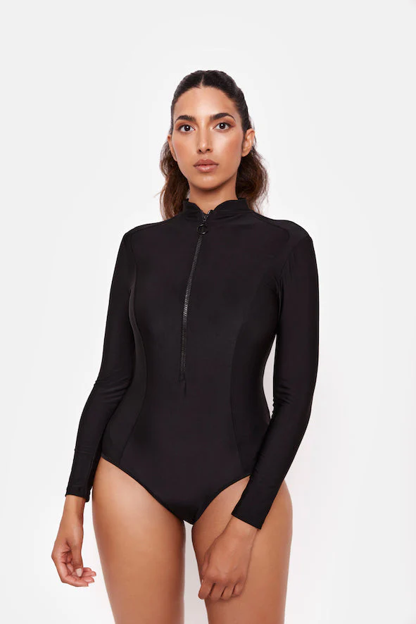 Sleek long-sleeve modest bodysuit swim-top with front zip.